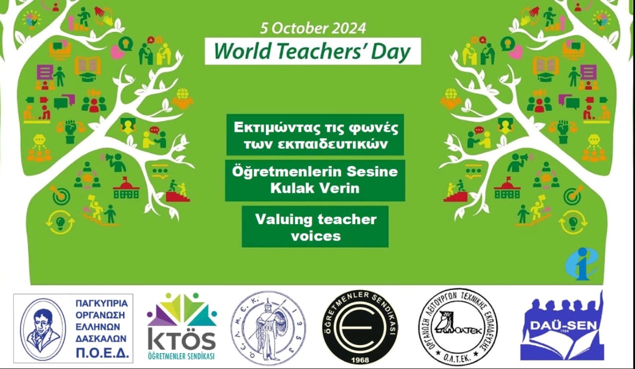 Eğitim Enternasyonali (EI) ve Avrupa Eğitim Sendikaları Komitesi (ETUCE) üyesi sendikalardan POED, KTÖS, OELMEK, KTOEÖS, OLTEK ve DAÜ-SEN 5 Ekim için ortak açıklama yaparak, “Herkes için daha iyi, daha adil bir gelecek inşa edebiliriz. Okullarımızda barışın, demokrasinin ve adaletin önemini öğretmek bizim sorumluluğumuz” vurgusunda bulundu.