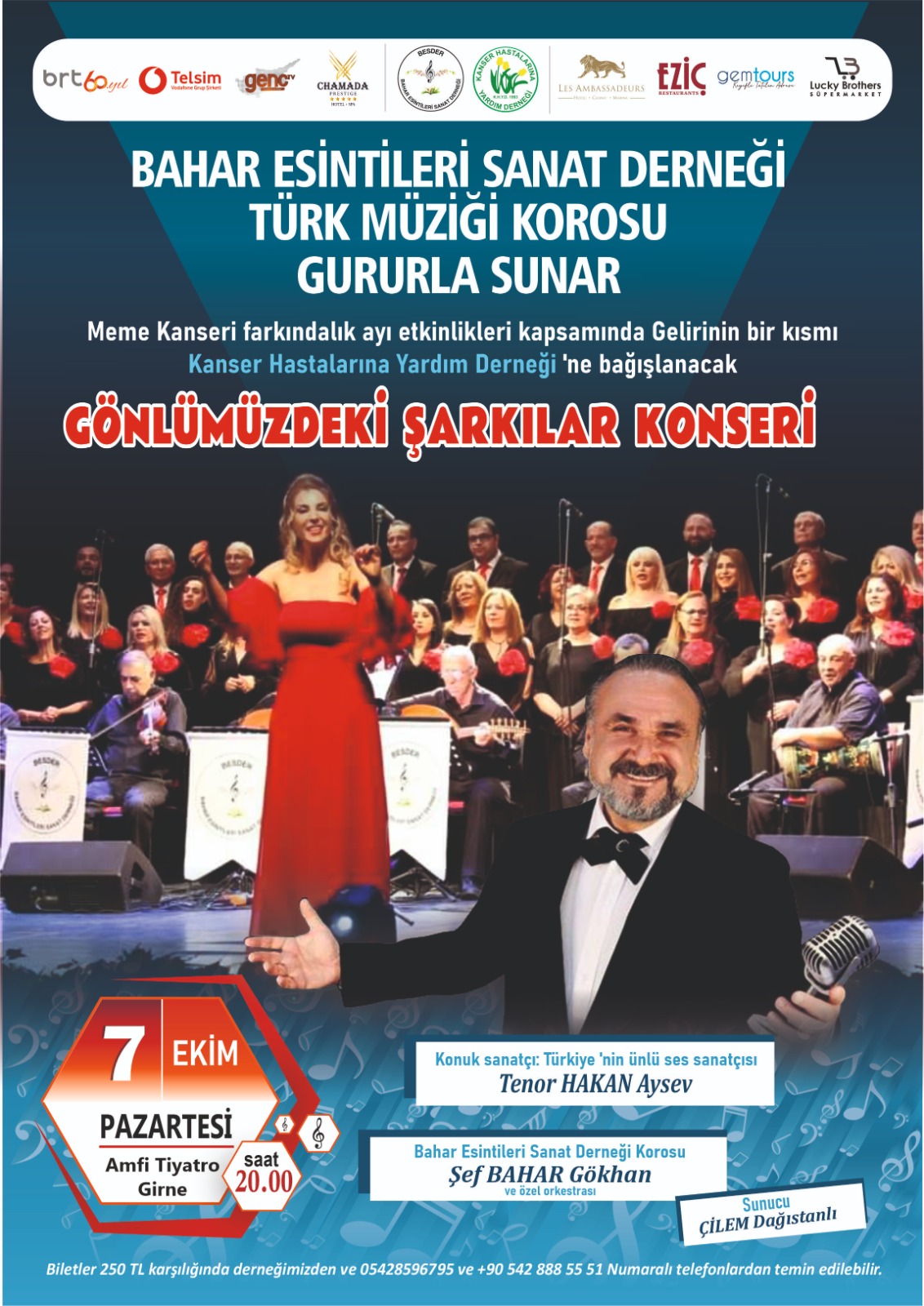 Bahar Esintileri Sanat Derneği Türk Müziği Korosu, Meme Kanseri farkındalık ayı etkinlikleri kapsamında, gelirinin bir kısmı Kanser Hastalarına Yardım Derneği’ne bağışlanacak “Gönlümüzdeki Şarkılar Konseri”ni yarın akşam 20.00’de gerçekleştiriyor.