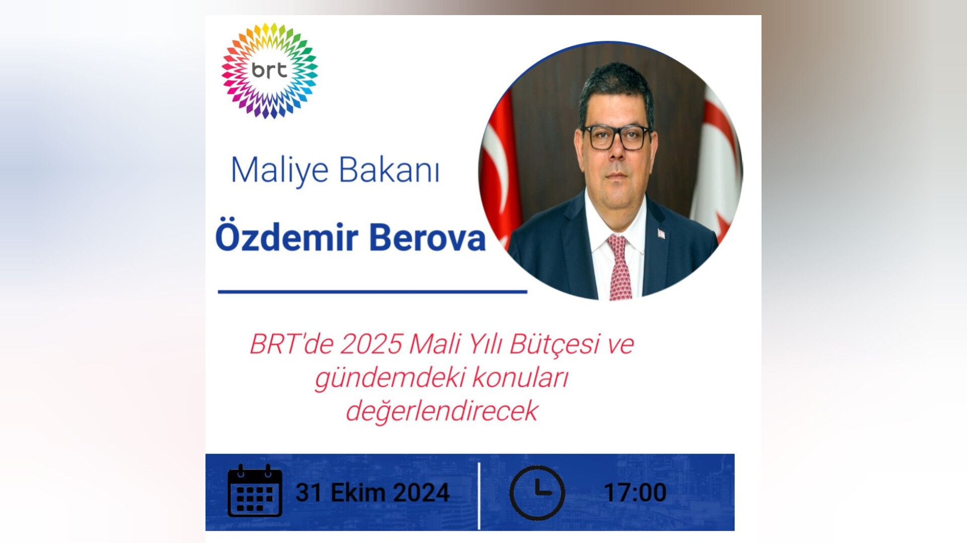 Maliye Bakanı Özdemir Berova, bugün saat 17.00’de BRT Özel Yayını’nda 2025 Mali Yılı Bütçesi ve gündemdeki konuları değerlendirecek.