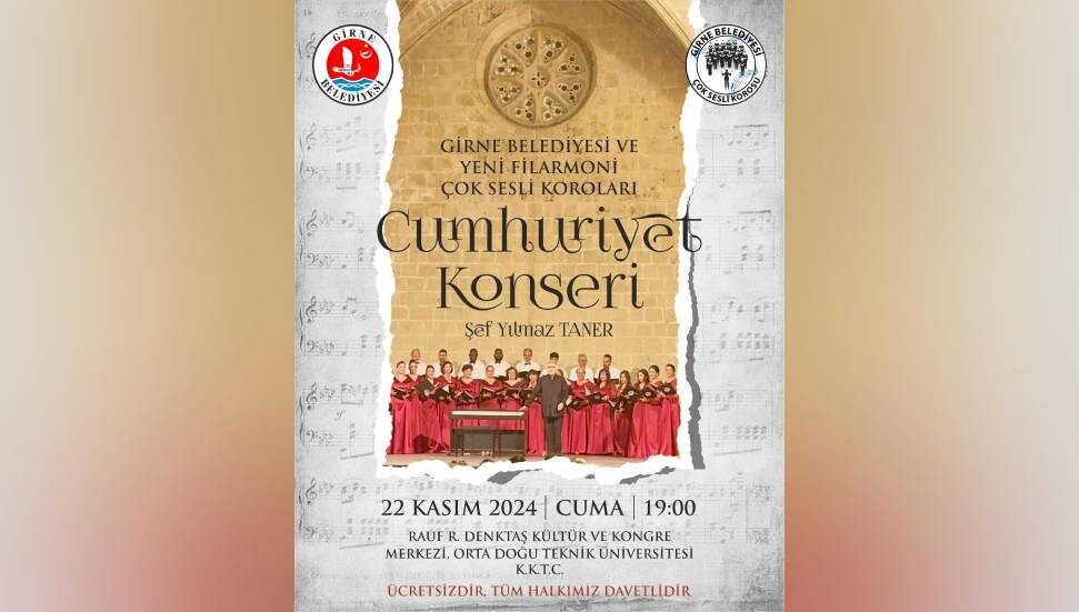 Girne Belediyesi Çok Sesli Korosu ve Filarmoni Çok Sesli Koroları, Şef Yılmaz Taner yönetiminde “Cumhuriyet Konseri” verecek.