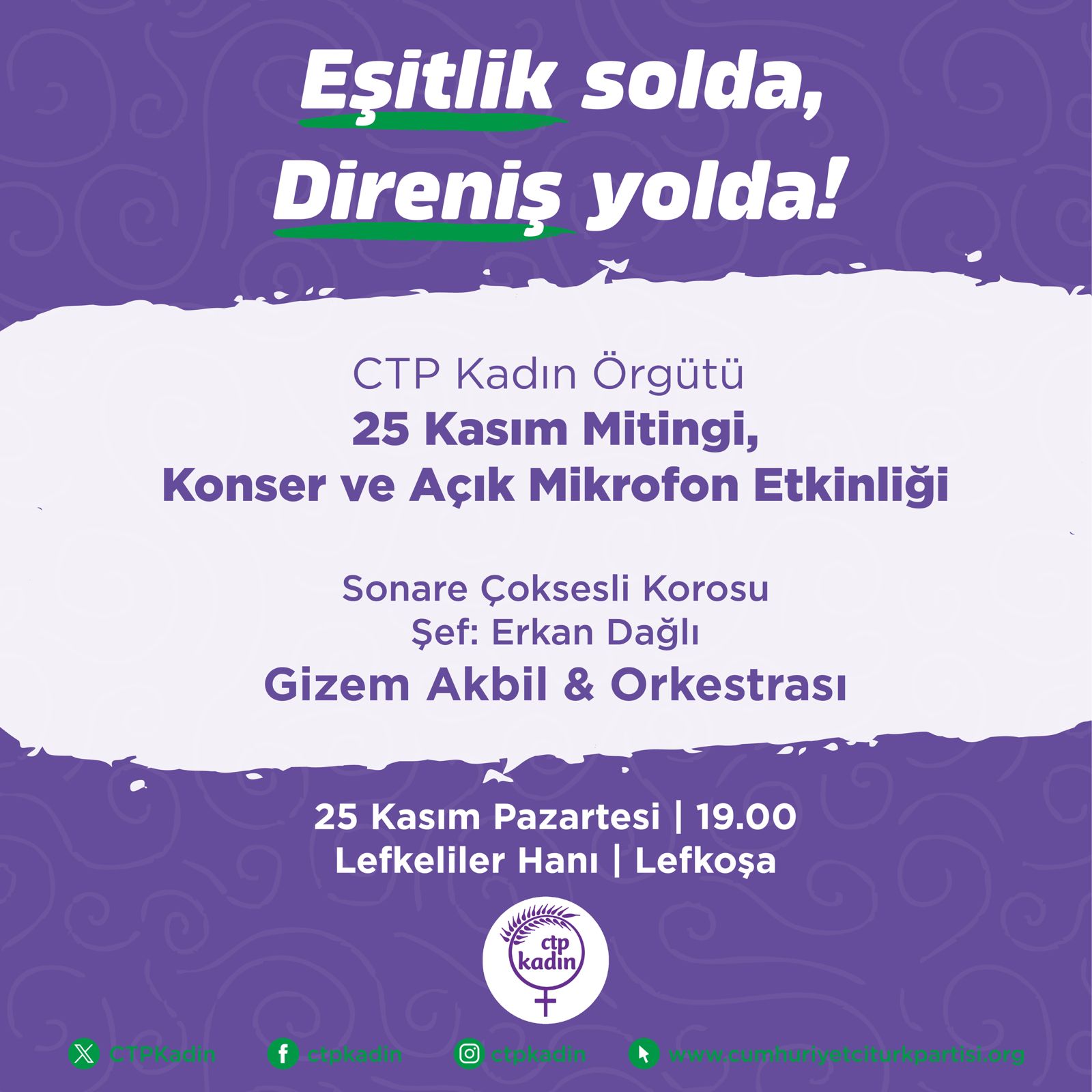 CTP’den yapılan açıklamaya göre, 25 Kasım Organizasyon Komitesi’nin yürüyüşünün ardından Lefkeliler Hanı’nda saat 19.00’da başlayacak konser ve açık mikrofon etkinliğine, CTP Genel Başkanı Tufan Erhürman da katılarak konuşma yapacak.