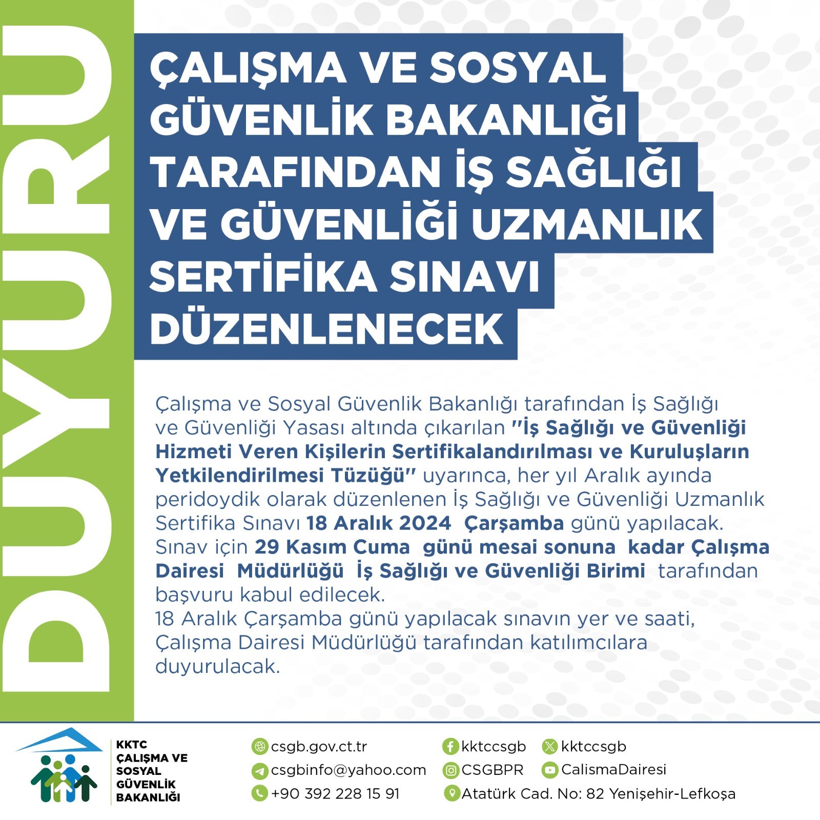 Çalışma ve Sosyal Güvenlik Bakanlığı, İş Sağlığı ve Güvenliği Yasası altında çıkarılan ”İş Sağlığı ve Güvenliği Hizmeti Veren Kişilerin Sertifikalandırılması ve Kuruluşların Yetkilendirilmesi Tüzüğü” uyarınca, her yıl aralık ayında düzenlenen İş Sağlığı ve Güvenliği Uzmanlık Sertifika Sınavı, 18 Aralık Çarşamba günü yapılacak.