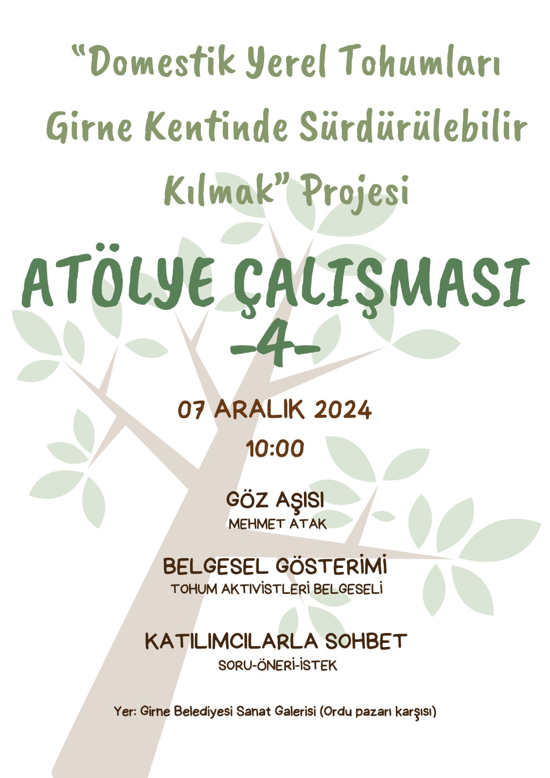Göz aşısı ve tohum aktivistleri ile ilgili belgesel gösterimi konularının irdeleneceği dördüncü atölye çalışması sonrasında, Şubat 2025’te vatandaşlarla paylaşılmak üzere tarım rehberi de oluşturulacak.