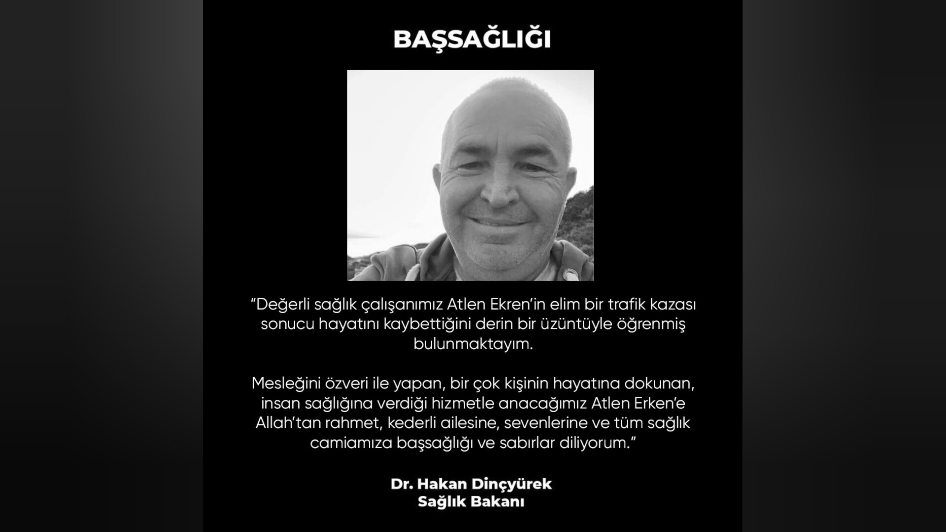 “Değerli sağlık çalışanımız Atlen Ekren’in elim bir trafik kazası sonucu hayatını kaybettiğini derin bir üzüntüyle öğrenmiş bulunmaktayım.