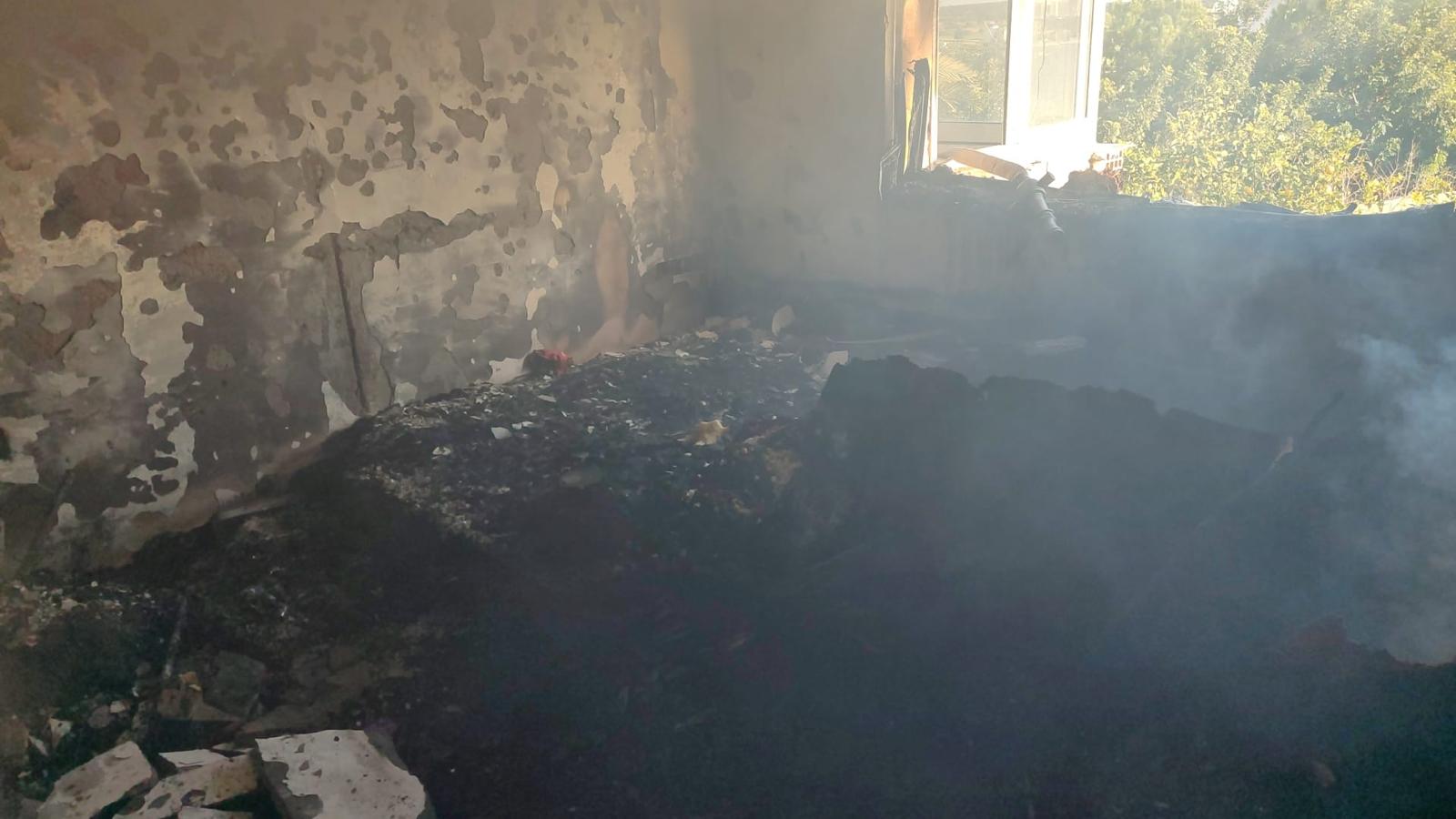 Çıkan yangın sonucu yatak odası ve eşyalar ve kapı tamamen, iki kapı kısmen yanarken, evin tüm odaları islendi, pencere camı ise ısıdan patladı.