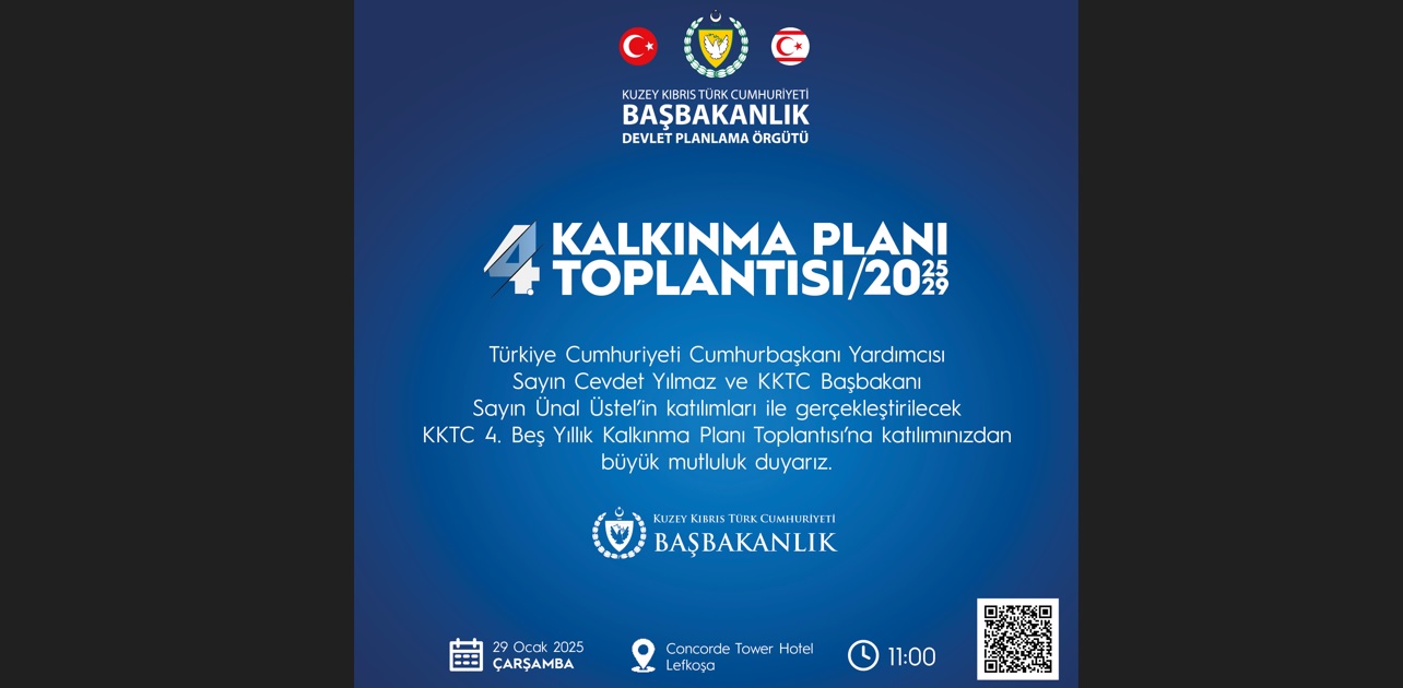 Başbakanlıktan verilen bilgiye göre, Devlet Planlama Örgütü tarafından, çarşamba günü saat 11.00’de Lefkoşa Concorde Tower Hotel’de yapılacak “KKTC 4. Beş Yıllık Kalkınma Planı Toplantısı” Türkiye Cumhuriyeti Cumhurbaşkanı Yardımcısı Cevdet Yılmaz ve Başbakanı Ünal Üstel’in katılımlarıyla gerçekleşecek.