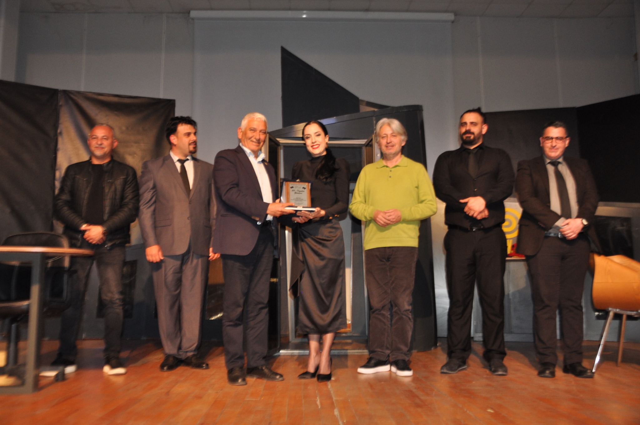 Güzelyurt Belediyesi’nden verilen bilgiye göre, Mahmut Özçınar oyunun sonunda Kıbrıs Türk Devlet Tiyatrosu ekibine anı plaketi de takdim etti.