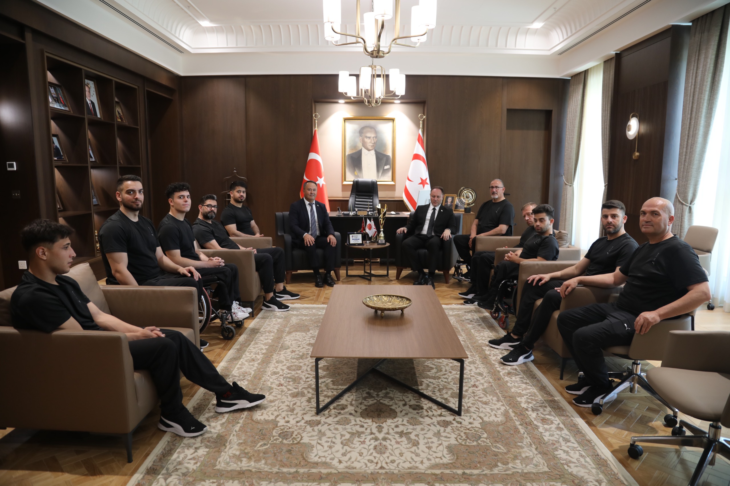 Cumhuriyet Meclisi Başkanı Ziya Öztürkler, İtalya’da düzenlenen Avrupa Kupası ön eleme turunu birinci tamamlayan Vakıflar Tekerlekli Sandalye Basketbol Takımı ve KKTC Engelliler Spor Federasyonu Başkanı Ahmet Akdeniz’i Yeni Meclis Binası’nda ağırladı.