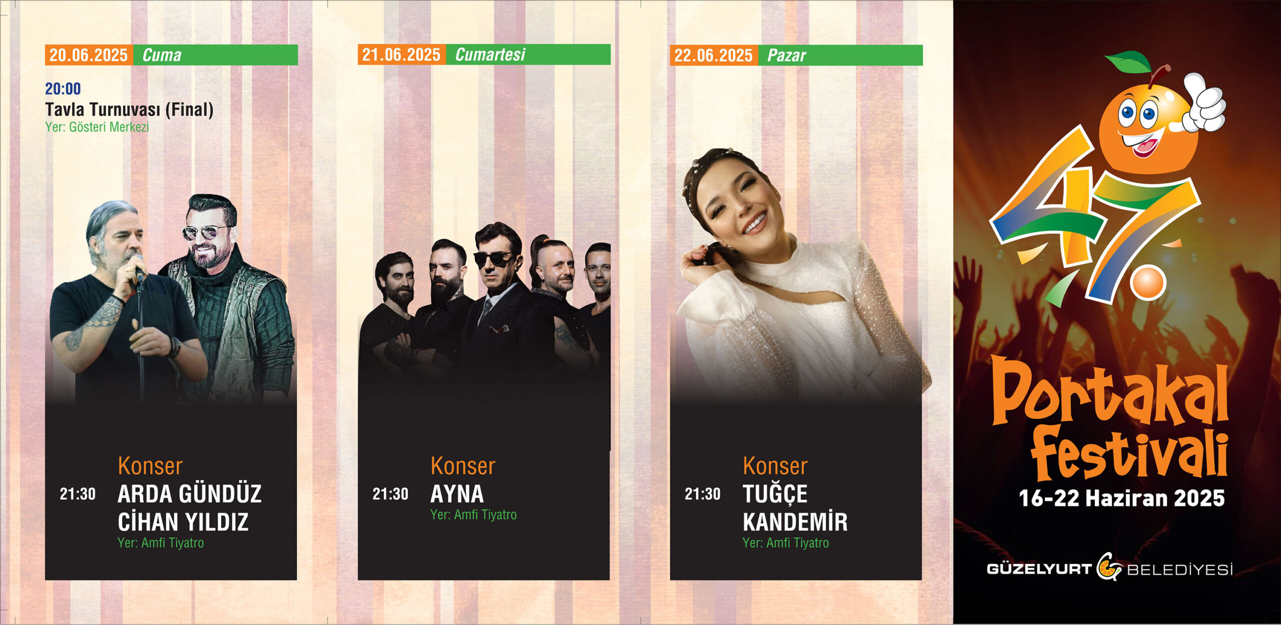 16-22 Haziran tarihleri arasında birçok etkinliğe ev sahipliği yapacak olan 47. Güzelyurt Portakal Festivali’nde Alisher Nazirov, Emre Fel, Ayna, Tuğçe Kandemir, Arda Gündüz, Cihan Yıldız, Grup Otantik ayrıca yiyecek ve içecek stantlarının ücretsiz olacağı çocuk şenliği, tavla turnuvası ve halı saha maçları yer alacak.