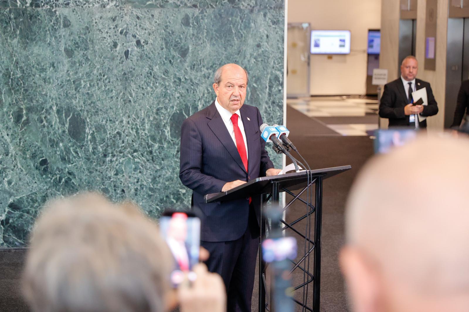 Cumhurbaşkanı Tatar, Birleşmiş Milletler (BM) ev sahipliğinde New York’ta gerçekleşen Kıbrıs konulu genişletilmiş 5+1 formatlı gayriresmi kapanış oturumunun ardından BM Merkezi’nde basın toplantısı düzenledi.