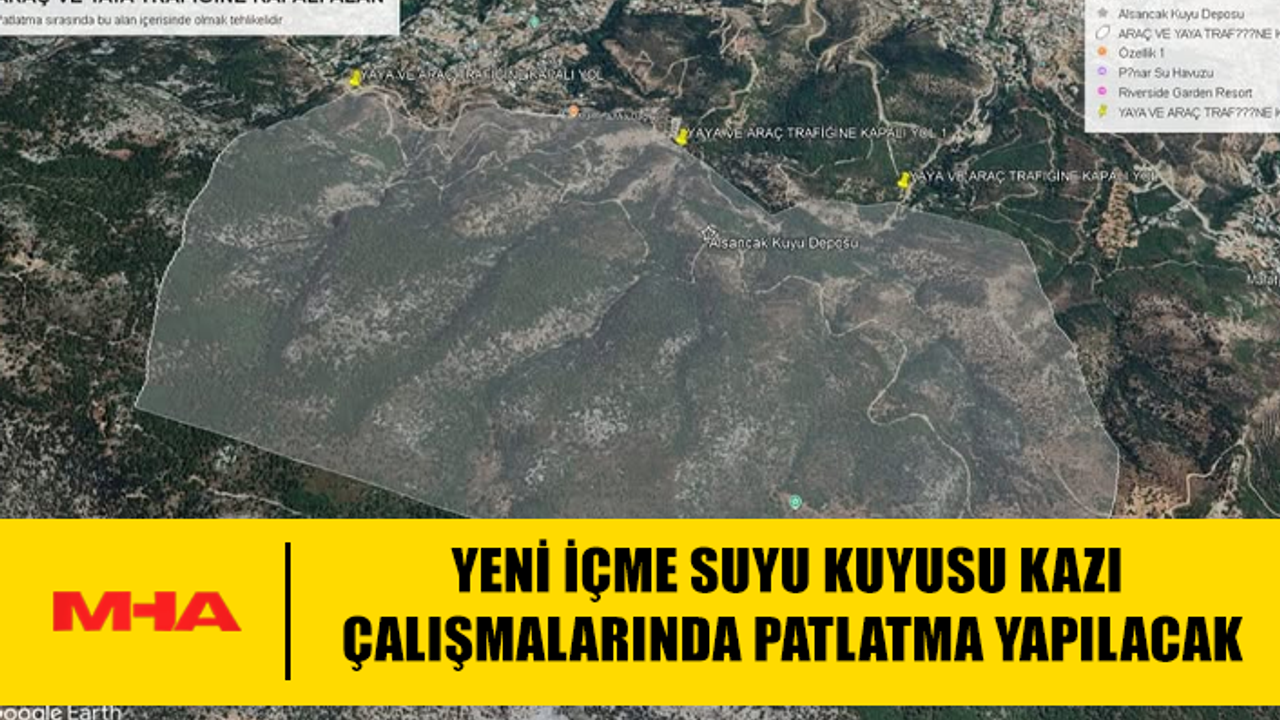 Belediyeden yapılan açıklamada, yeni içme suyu kuyusu kazı çalışmaları kapsamında saat 10.00’da patlatma yapılacağı belirtilerek, bu süre zarfında haritada gösterilen alan ve dağ yollarının araç ve yaya trafiğine kapatılacağı duyuruldu.