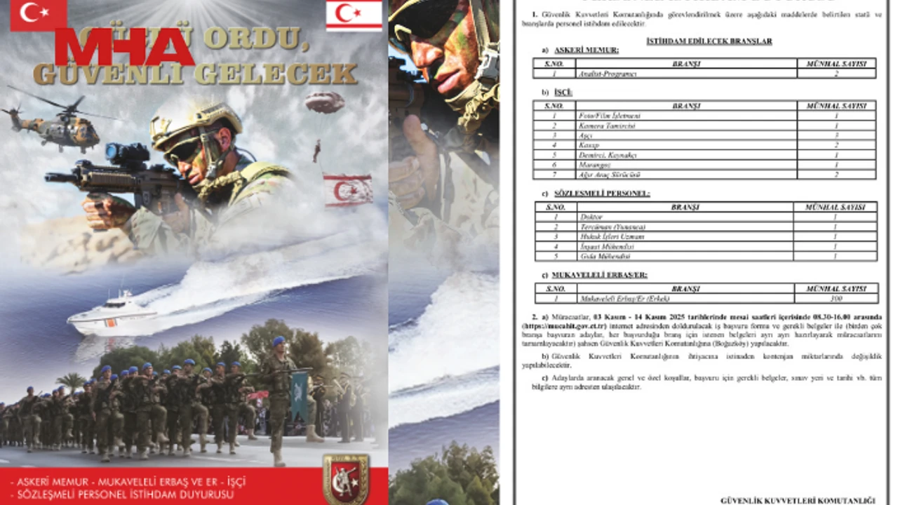 Güvenlik Kuvvetleri Komutanlığı, çeşitli hizmet sınıflarında istihdam edilecek personel için 14 Kasım tarihine kadar müracaat kabul edeceğini açıkladı.