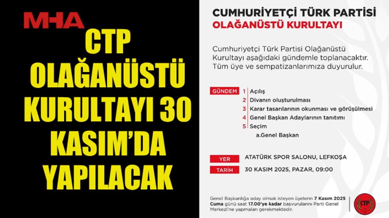 Cumhuriyetçi Türk Partisi (CTP), Olağanüstü Kurultayını 30 Kasım 2025 Pazar günü düzenleyecek. Kurultay, saat 09.00’da Lefkoşa’daki Atatürk Spor Salonu’nda gerçekleştirilecek. Parti, tüm üye ve sempatizanlarını kurultaya davet etti.