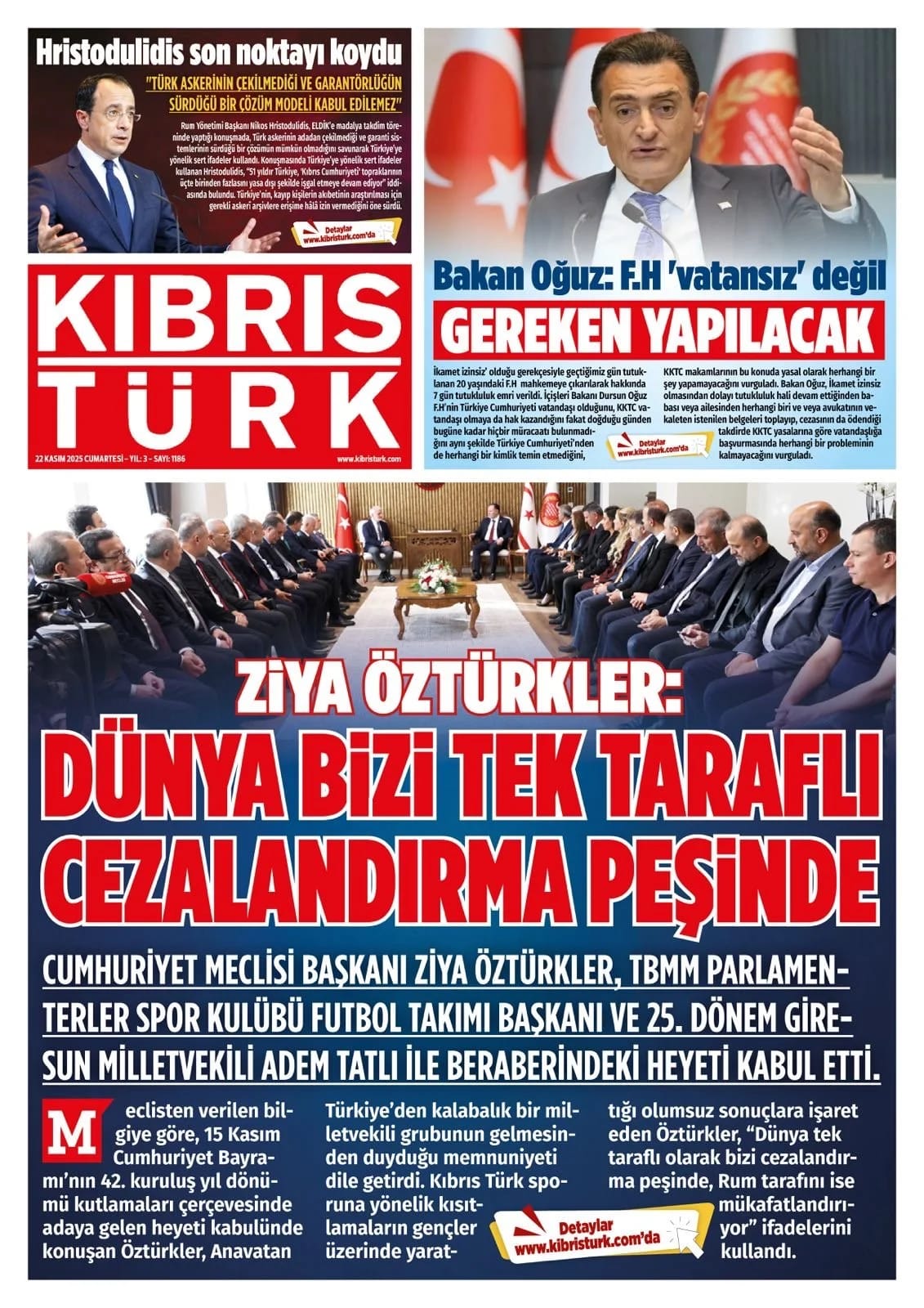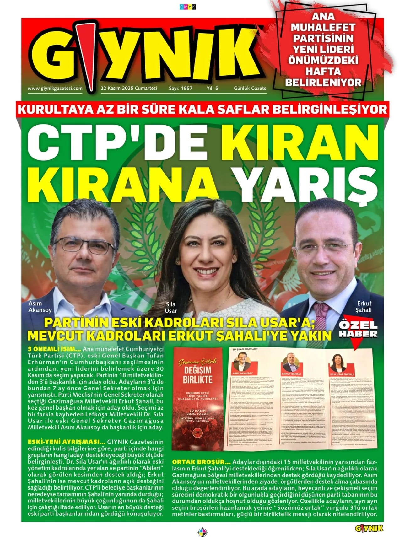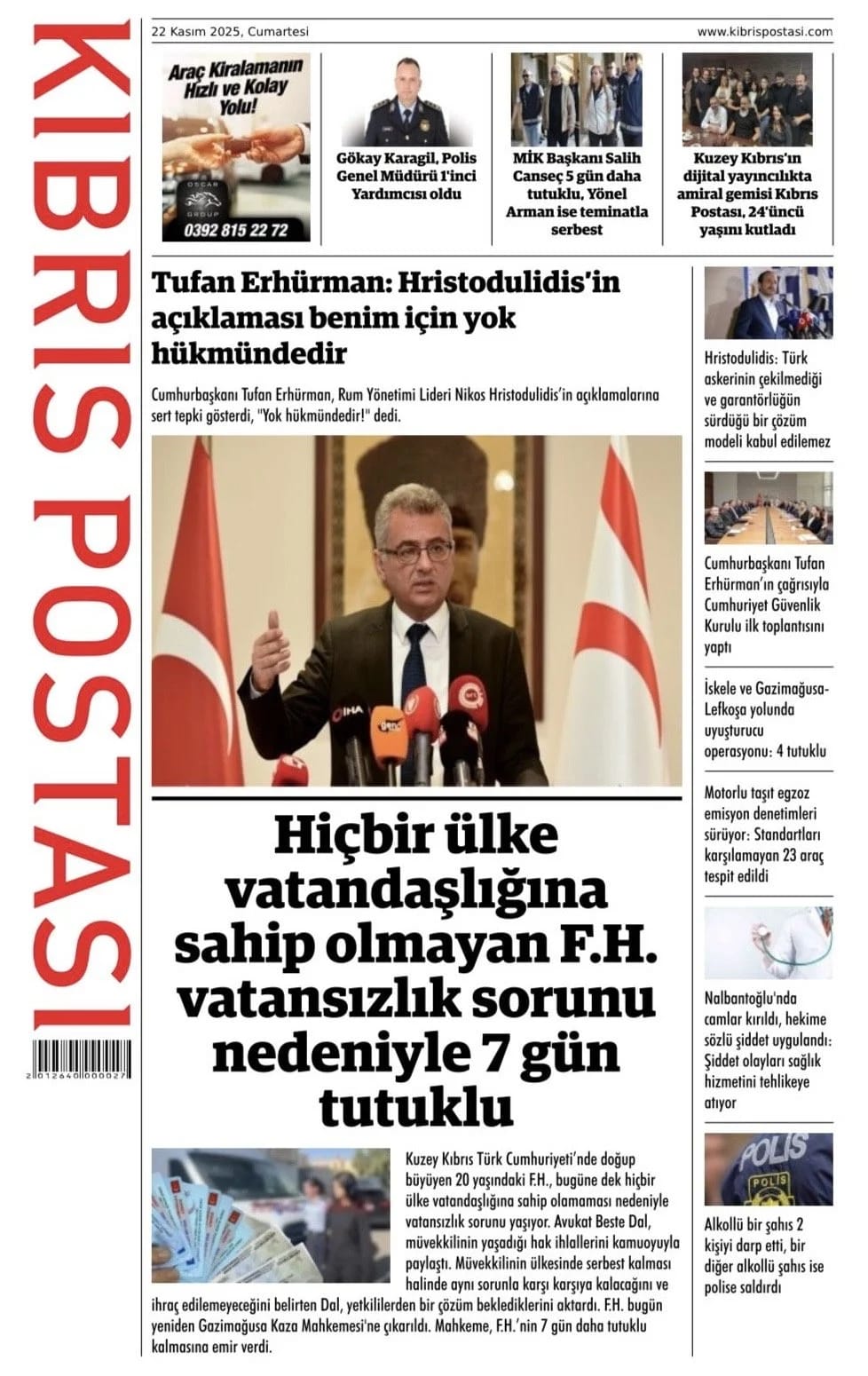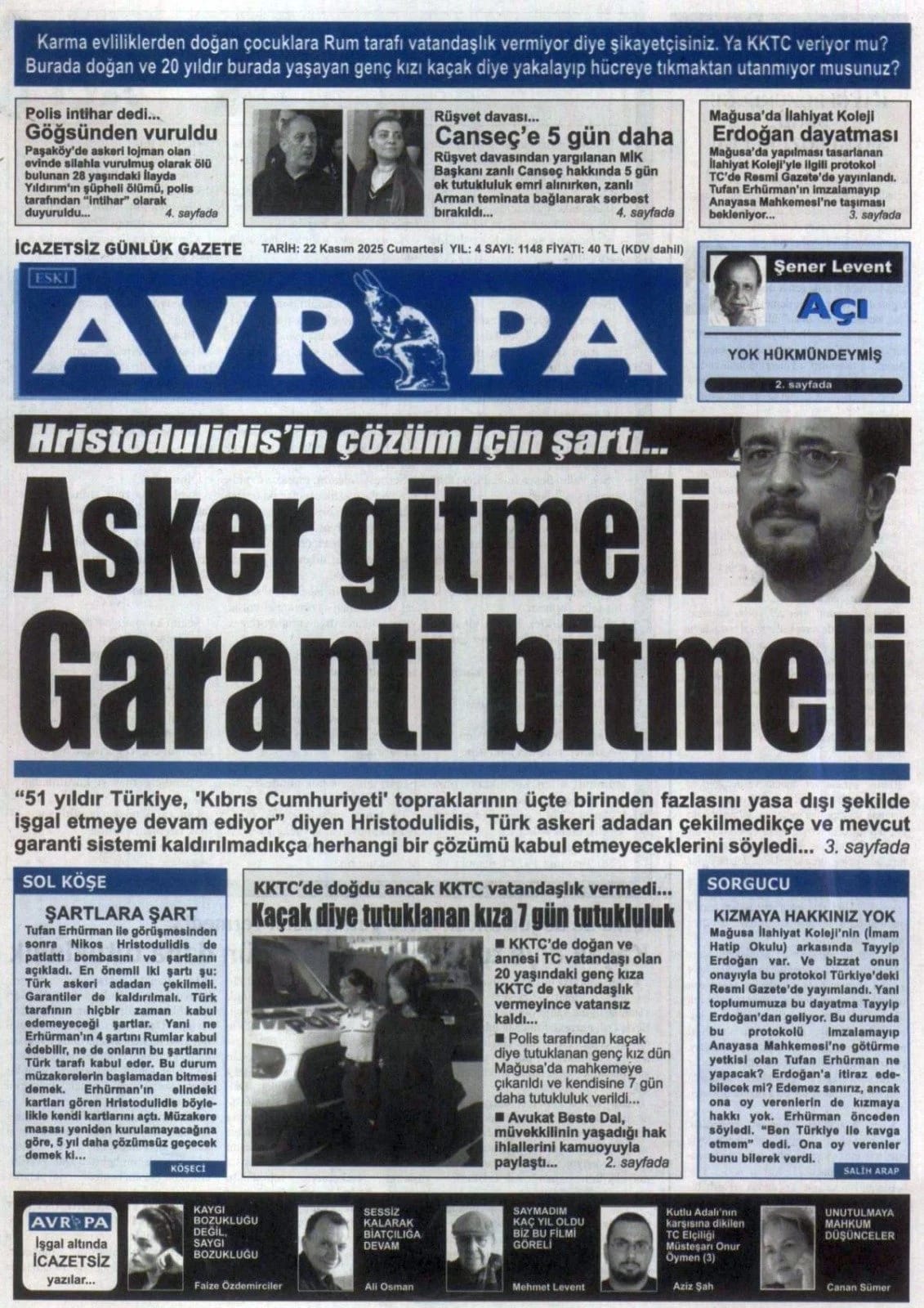 KıbrısGAZETE MANŞETLERİ (22 KASIM 2025)Kasım 22, 2025 9:27 am Paylaş İlgili haberler GİRNE–TATLISU YOLUNDAKİ KAZANIN ZANLISI TEMİNATA BAĞLANDI Aralık 23, 2025 YASA DIŞI KAÇIŞ PLANI ÇÖKTÜ, ZANLILAR CEZAEVİNE GÖNDERİLDİ Aralık 23, 2025 ÇANAKKALE'DE YOL 13 YILDIR HER YAĞIŞTA GÖLE DÖNÜYOR Aralık 23, 2025 Cevap bırakın Yanıtı iptal etE-posta adresiniz yayınlanmayacak. Gerekli alanlar * ile işaretlenmişlerdirYorumAd * E-posta * İnternet sitesi Daha sonraki yorumlarımda kullanılması için adım, e-posta adresim ve site adresim bu tarayıcıya kaydedilsin.