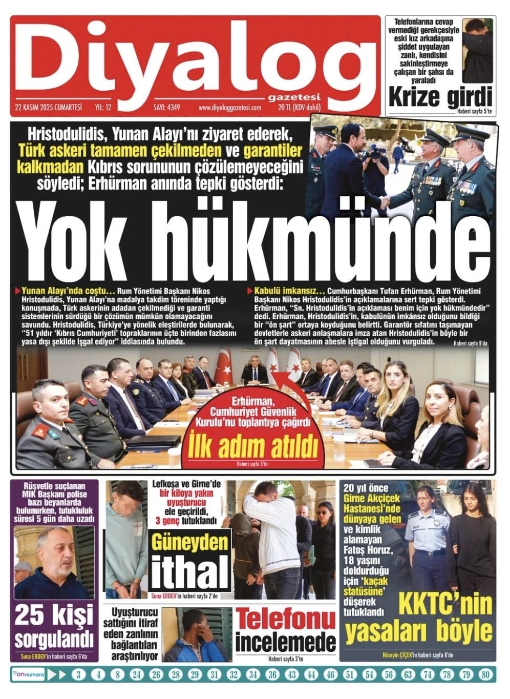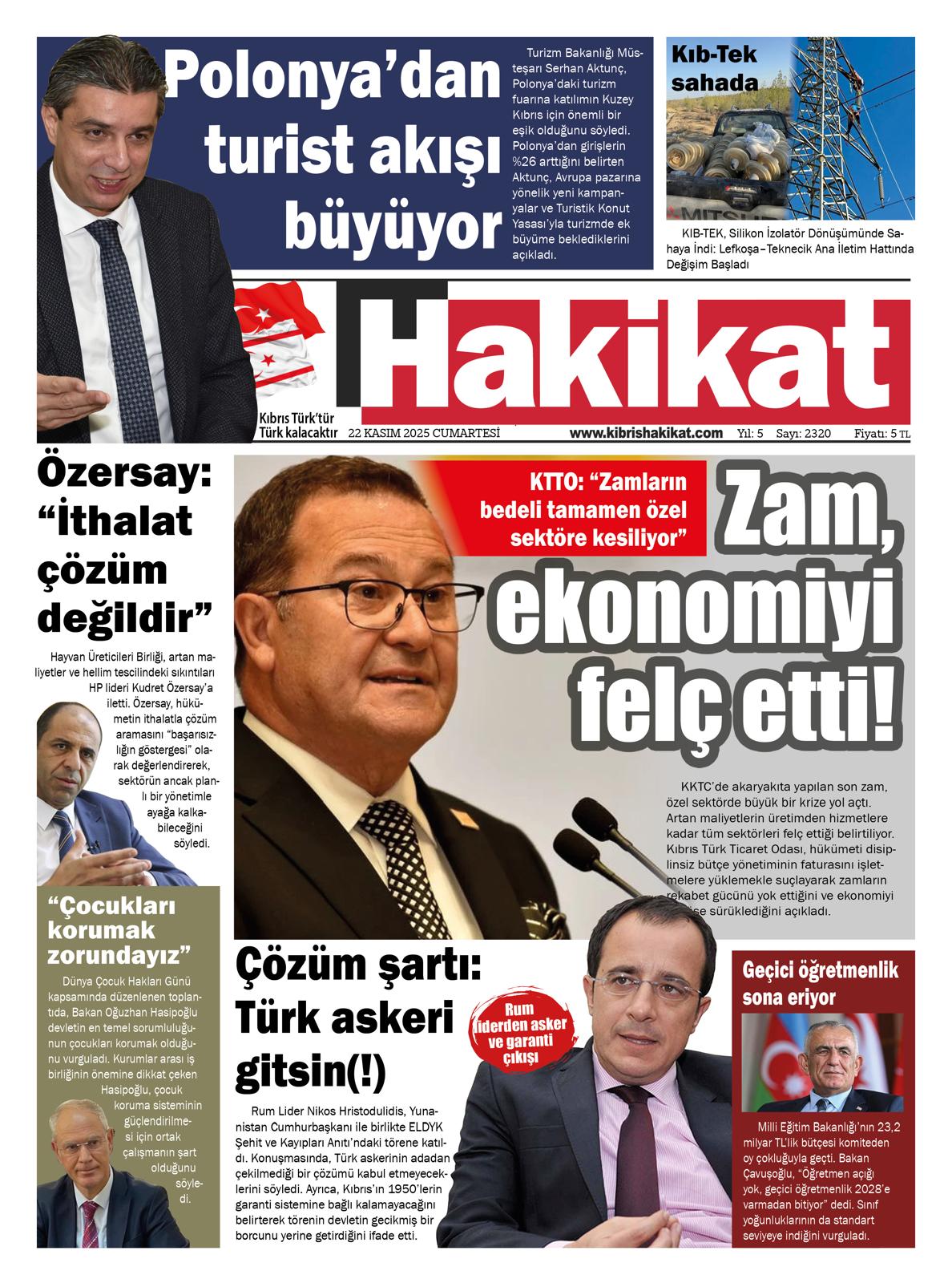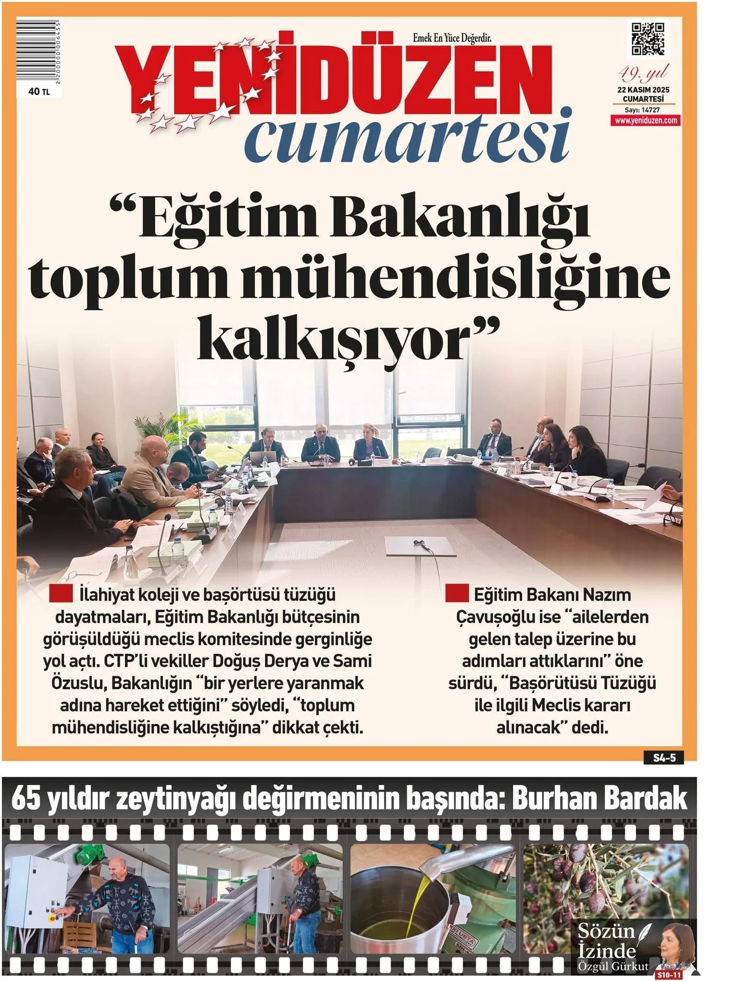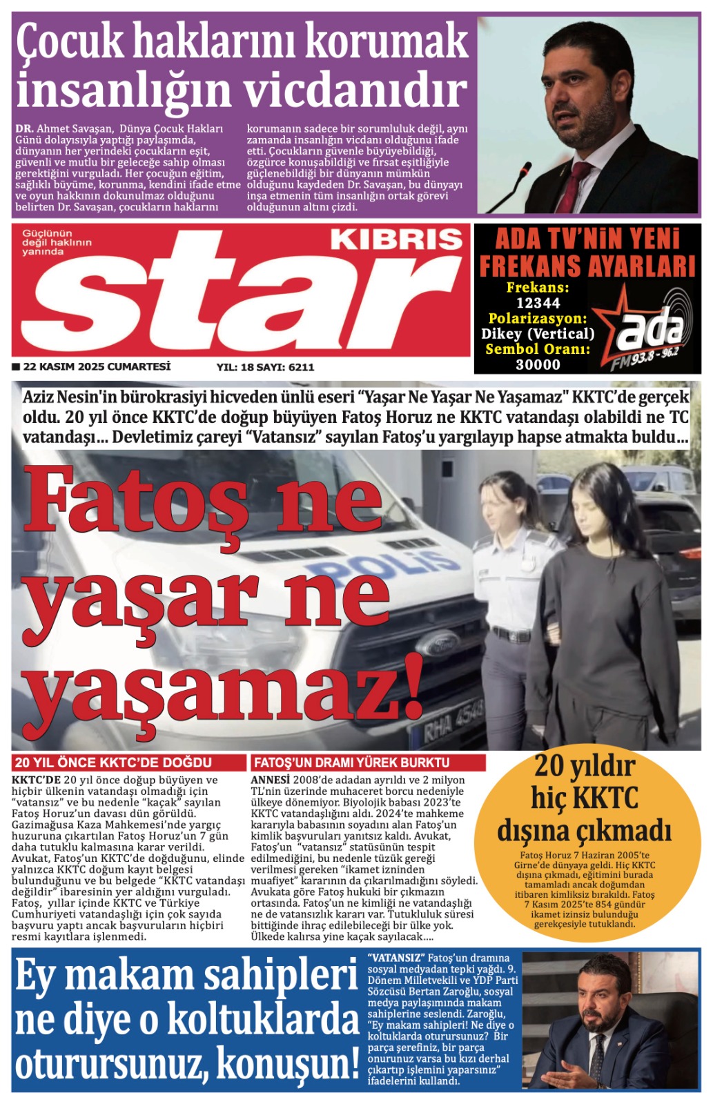 KıbrısGAZETE MANŞETLERİ (22 KASIM 2025)Kasım 22, 2025 9:27 am Paylaş İlgili haberler GİRNE–TATLISU YOLUNDAKİ KAZANIN ZANLISI TEMİNATA BAĞLANDI Aralık 23, 2025 YASA DIŞI KAÇIŞ PLANI ÇÖKTÜ, ZANLILAR CEZAEVİNE GÖNDERİLDİ Aralık 23, 2025 ÇANAKKALE'DE YOL 13 YILDIR HER YAĞIŞTA GÖLE DÖNÜYOR Aralık 23, 2025 Cevap bırakın Yanıtı iptal etE-posta adresiniz yayınlanmayacak. Gerekli alanlar * ile işaretlenmişlerdirYorumAd * E-posta * İnternet sitesi Daha sonraki yorumlarımda kullanılması için adım, e-posta adresim ve site adresim bu tarayıcıya kaydedilsin.