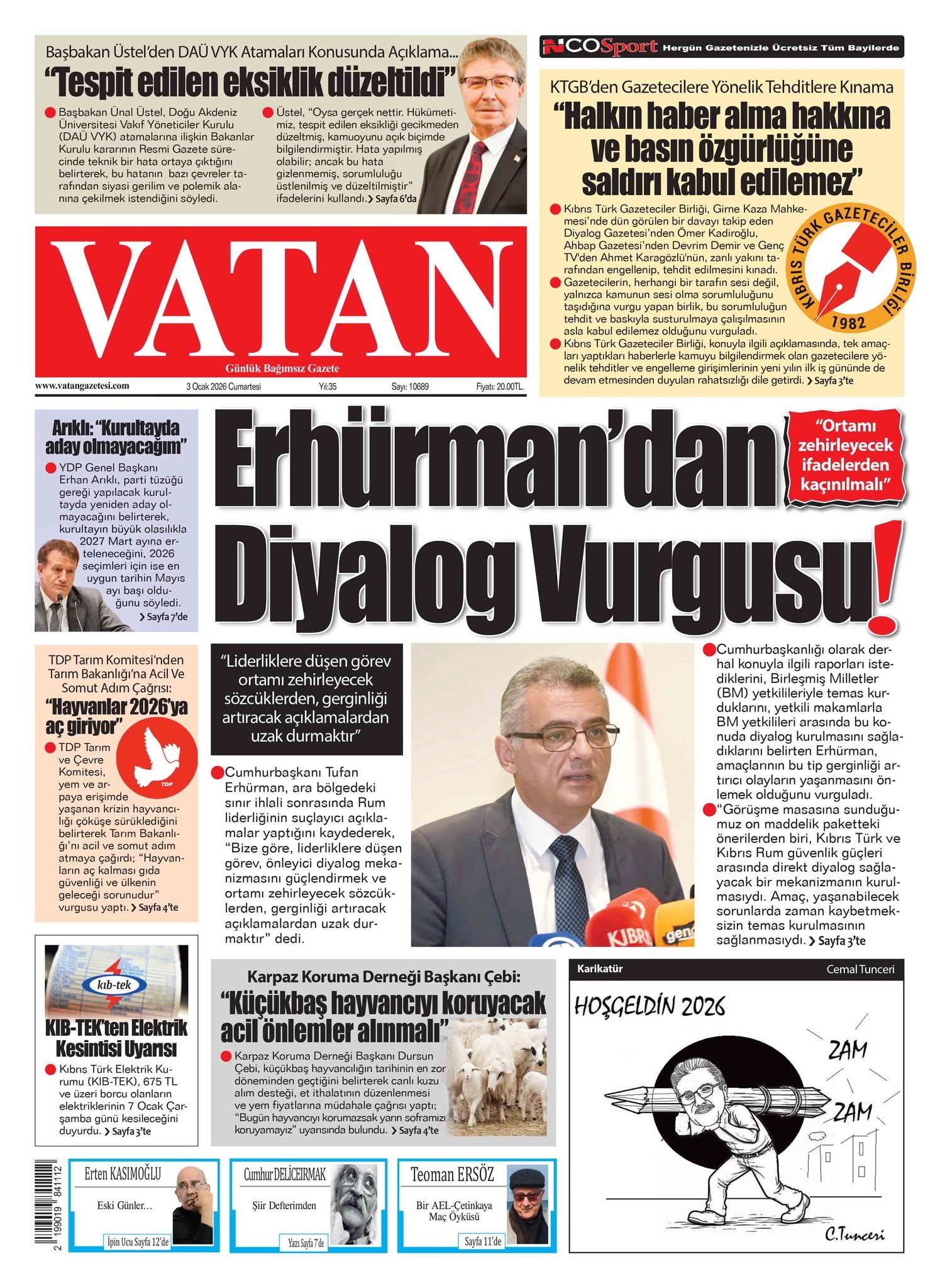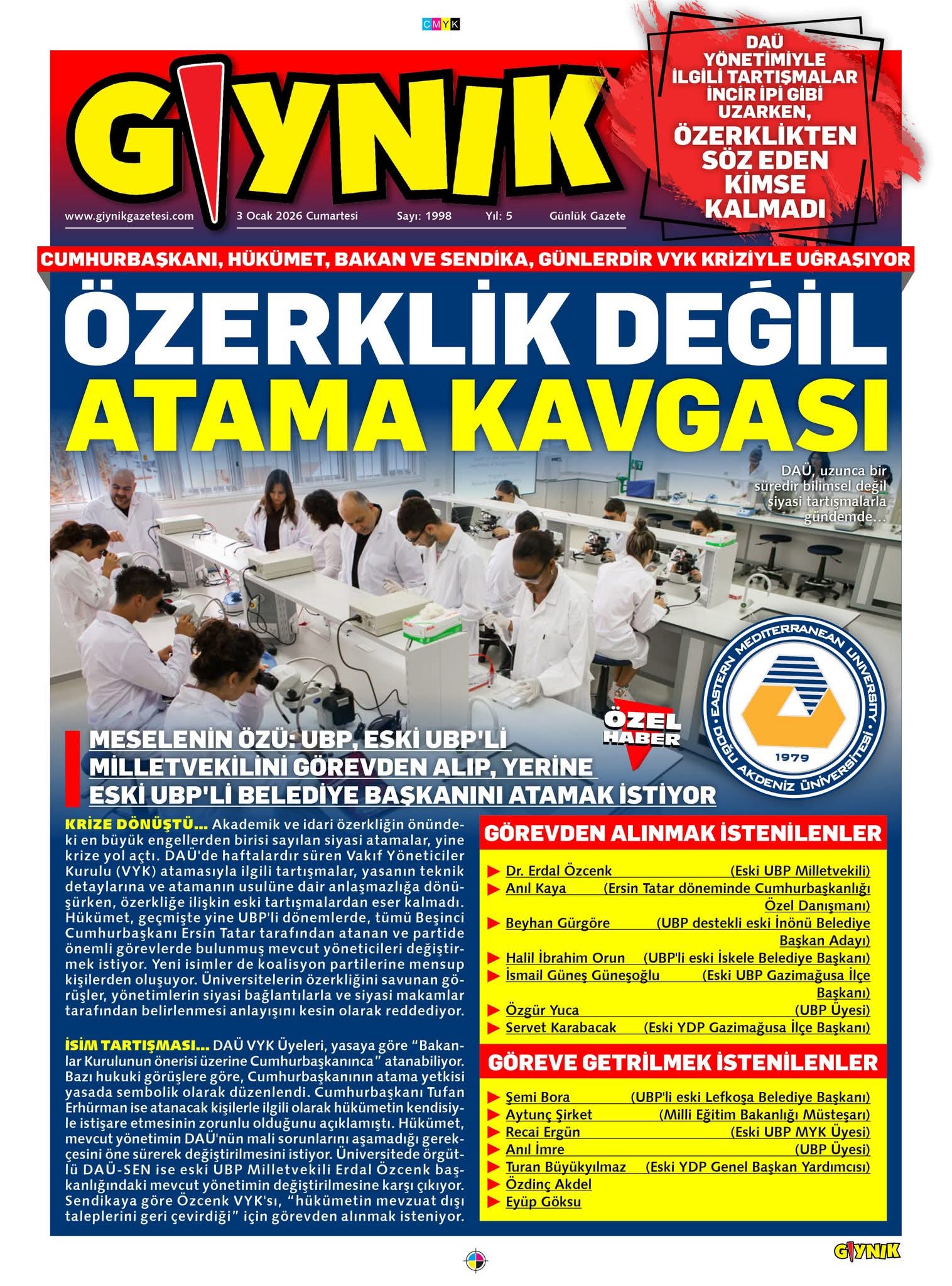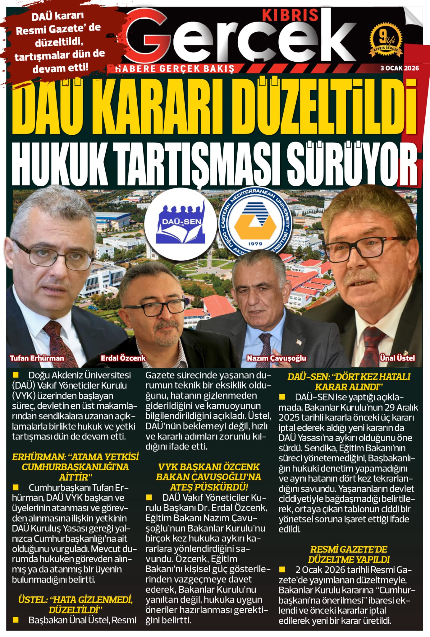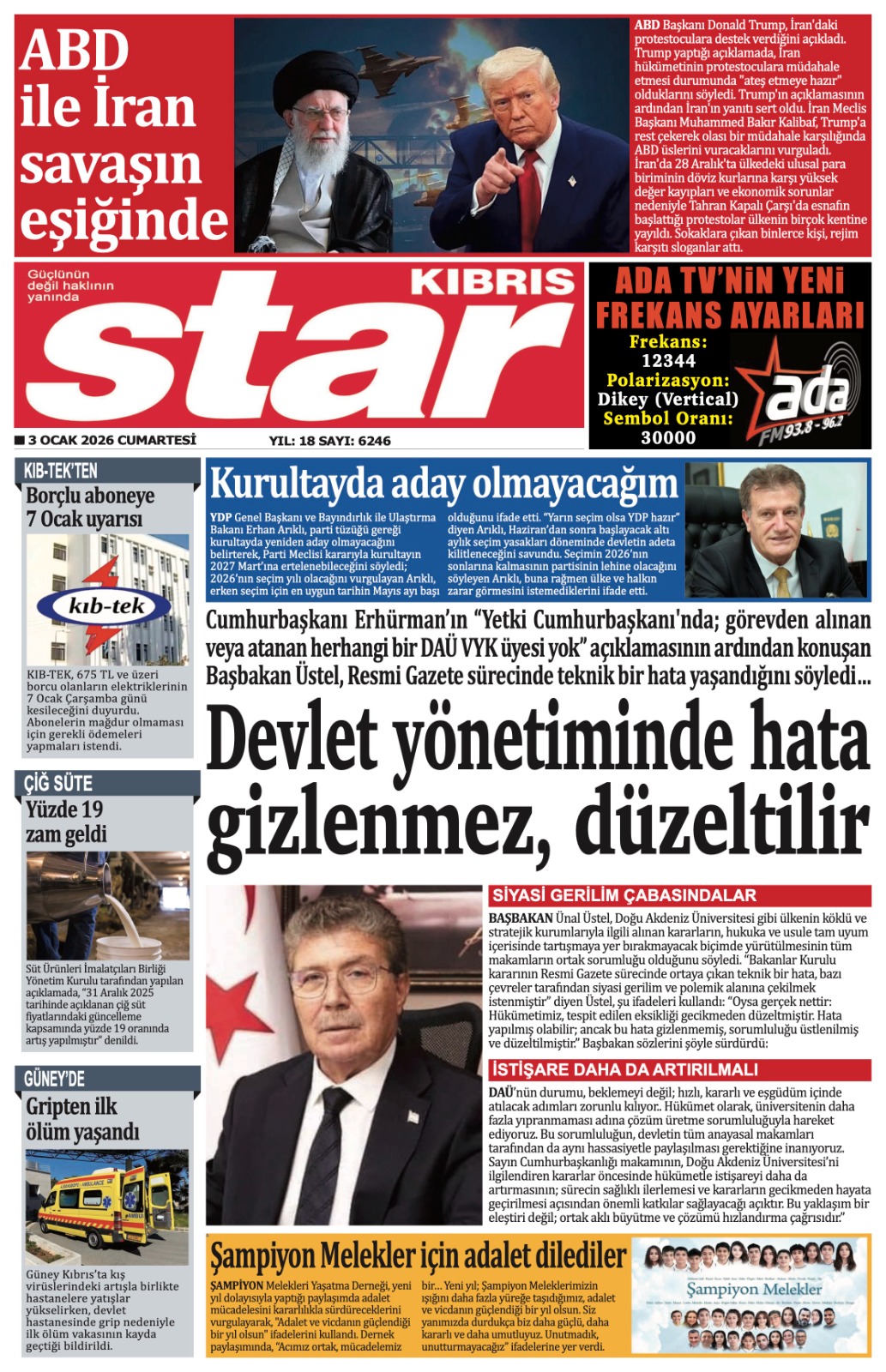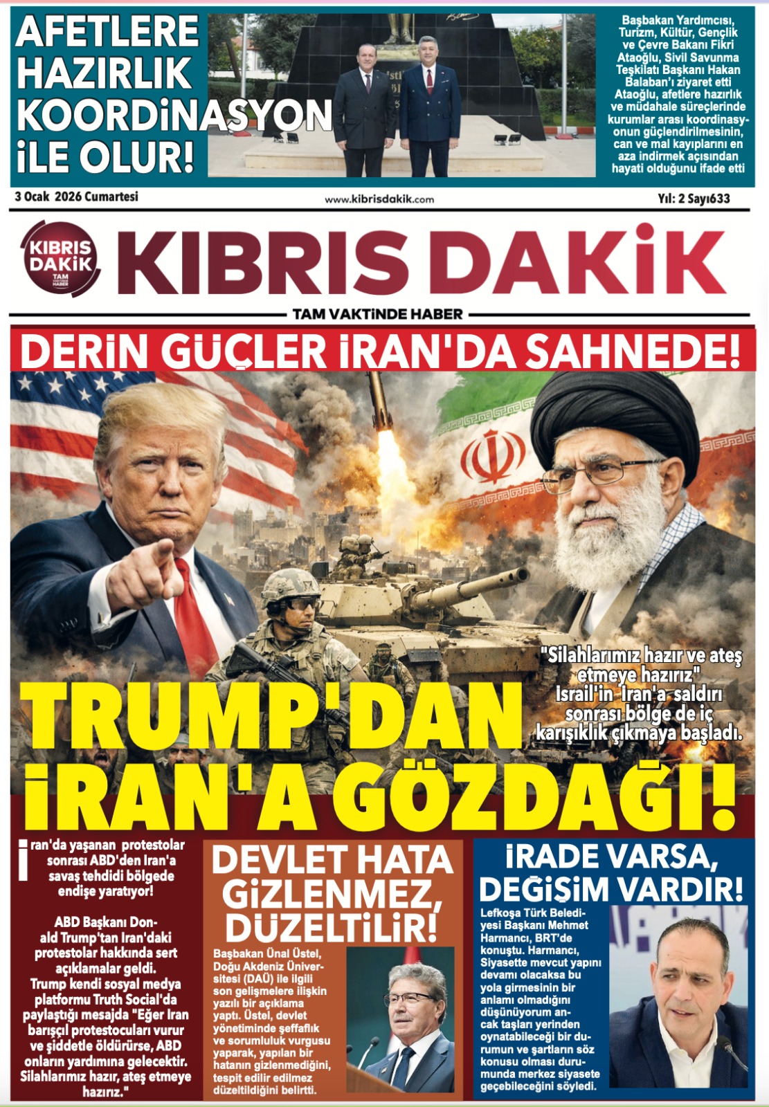 KıbrısManşetGAZETE MANŞETLERİ (3 OCAK 2026)Ocak 3, 2026 8:35 am PaylaşEtiketlendi:Kibrisdakik.com KKTC Gazete Manşetleri 5 Kasım 2025 İlgili haberler HAMİLEYKEN İKİNCİ KEZ HAMİLE KALDI! Ocak 9, 2026 VETERİNER HEKİMLER BİRLİĞİ: “ŞAP SÜRECİNDE REHAVETE KAPILMAYIN” Ocak 9, 2026 “SPORUN VİZYONU EĞİTİM SEMİNERİ” ANKARA’DA ORGANİZE EDİLDİ Ocak 9, 2026 Cevap bırakın Yanıtı iptal etE-posta adresiniz yayınlanmayacak. Gerekli alanlar * ile işaretlenmişlerdirYorumAd * E-posta * İnternet sitesi Daha sonraki yorumlarımda kullanılması için adım, e-posta adresim ve site adresim bu tarayıcıya kaydedilsin.