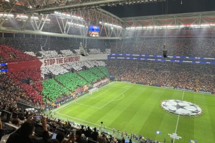 Sarı-kırmızılı taraftarların karşılaşma öncesi dev Filistin bayrağı ve “Soykırımı durdurun” (Stop The Genocide) yazısıyla oluşturdukları koreografi, katil İsrail’in medyasının UEFA&#...