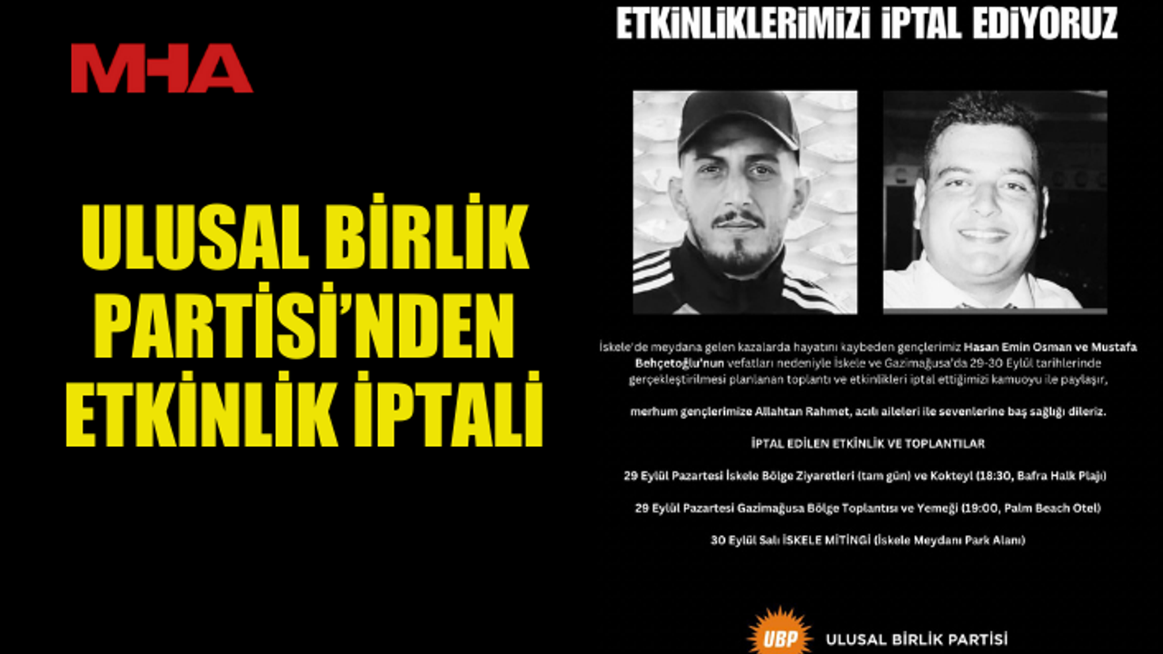 Ergün Yahat İskele ilçesinde meydana gelen ölümler sonrasında UBP, 29-30 Eylül tarihleri arasında gerçekleştireceği etkinlikleri iptal ettiğini açıkladı. UBP’nin almış olduğu bu karar, vatandaşl...