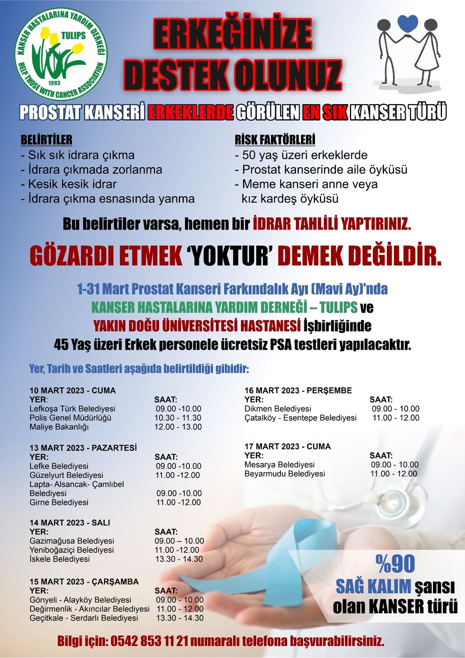 1-31 Mart Prostat Kanseri Farkındalık Ayı’nda (Mavi Ay) erkeklerde en sık görülen kanser türü olan Prostat Kanserine vurgu yapmak amacıyla, Kanser Hastalarına Yardım Derneği – Tulips ve Yakın Doğu Ün...