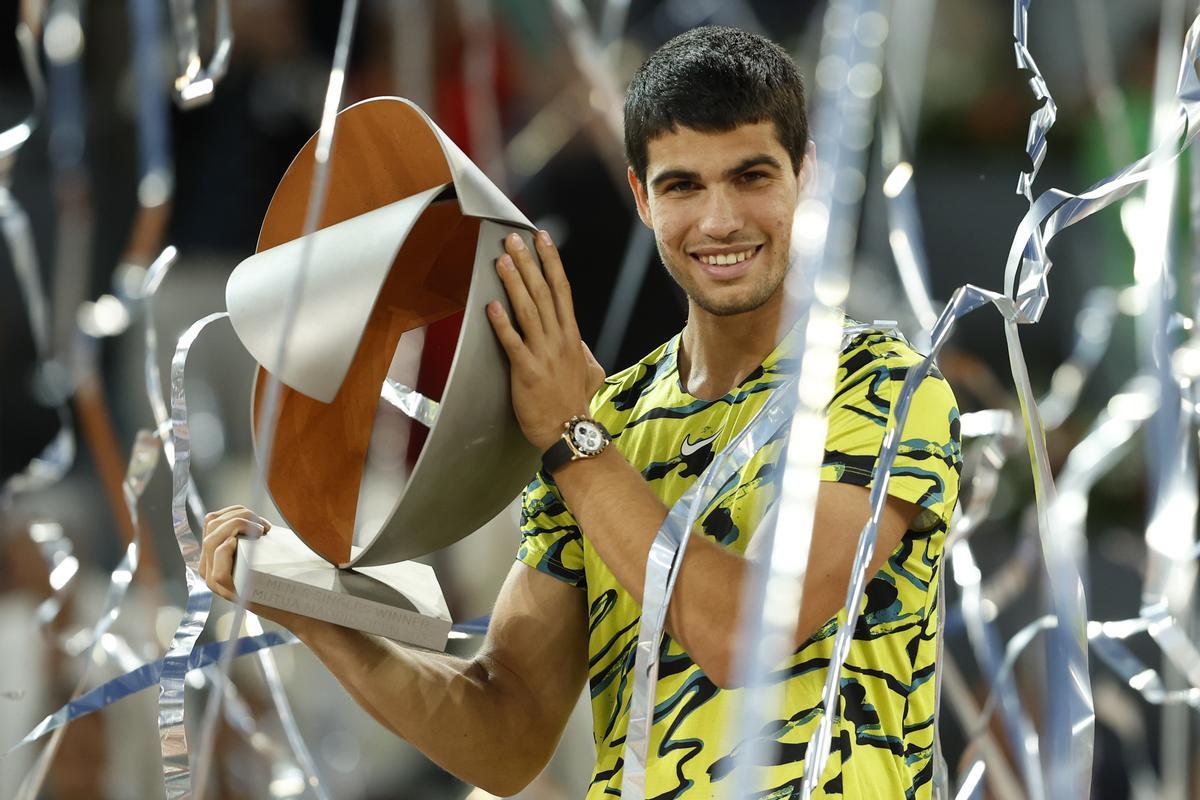 Madrid Açık Masters Tenis Turnuvası’nı, tek erkeklerde Alman Jan-Lennard Struff 2-1 yenen İspanyol Carlos Alcaraz kazandı. Sahadan 2 saat 26 dakika sonunda 2-1 galip ayrılan Alcaraz, Madrid Açık’ta ar...